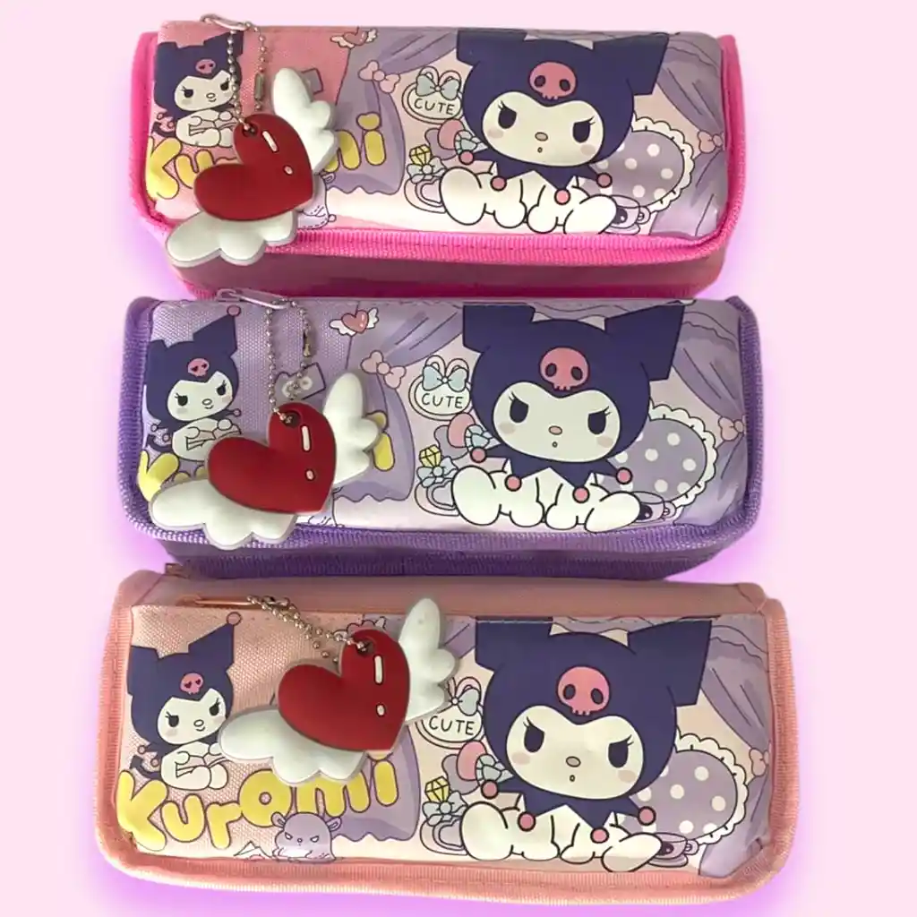 Cartuchera con doble espacio para guardar todo. Cada espacio cuenta con su cremallera para que nada se vaya a caer. El material es de escelente calidad y tiene buena resistencia. La cartuchera viene de Kuromi y además trae una manija de corazón para cargarla