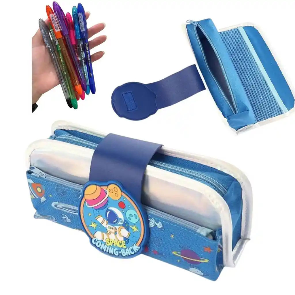 Este es un estuche para lápices,esferos con temática espacial. Presenta un diseño de astronauta y planetas, con un parche de goma . Tiene una gran capacidad, con múltiples compartimentos para organizar útiles escolares. El material es resistente y diseñado para soportar un uso frecuente. El estuche es adecuado para estudiantes, niños y niñas, y se puede utilizar para la escuela u oficina.