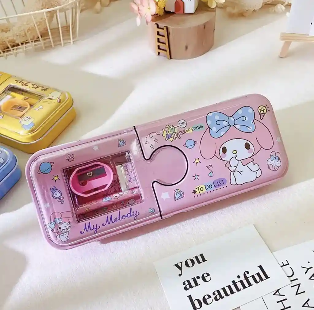 Cartuchera Sanrio Kit • Material: Metal • Medidas: 21.5x9x3cm aprox • El paquete incluye: 1 cartuchera con 1 lápiz, 1 tajalápiz, 1 borrador, 1 regla *Debido a factores como la luz y las pantallas, existen ligeras diferencias entre el producto y la imagen*
