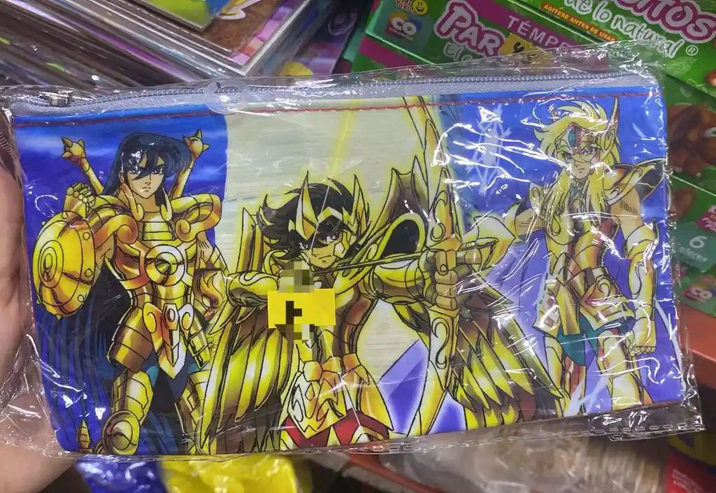 Presenta a varios Caballeros de Oro, incluidos Aioros de Sagitario (centro) y Saga de Géminis (izquierda). El diseño es de tipo "Fantasy" o no oficial, común en productos de papelería y juguetes. El material es plástico con un cierre de cremallera. Es un artículo dirigido a coleccionistas y fanáticos de la serie de anime y manga.