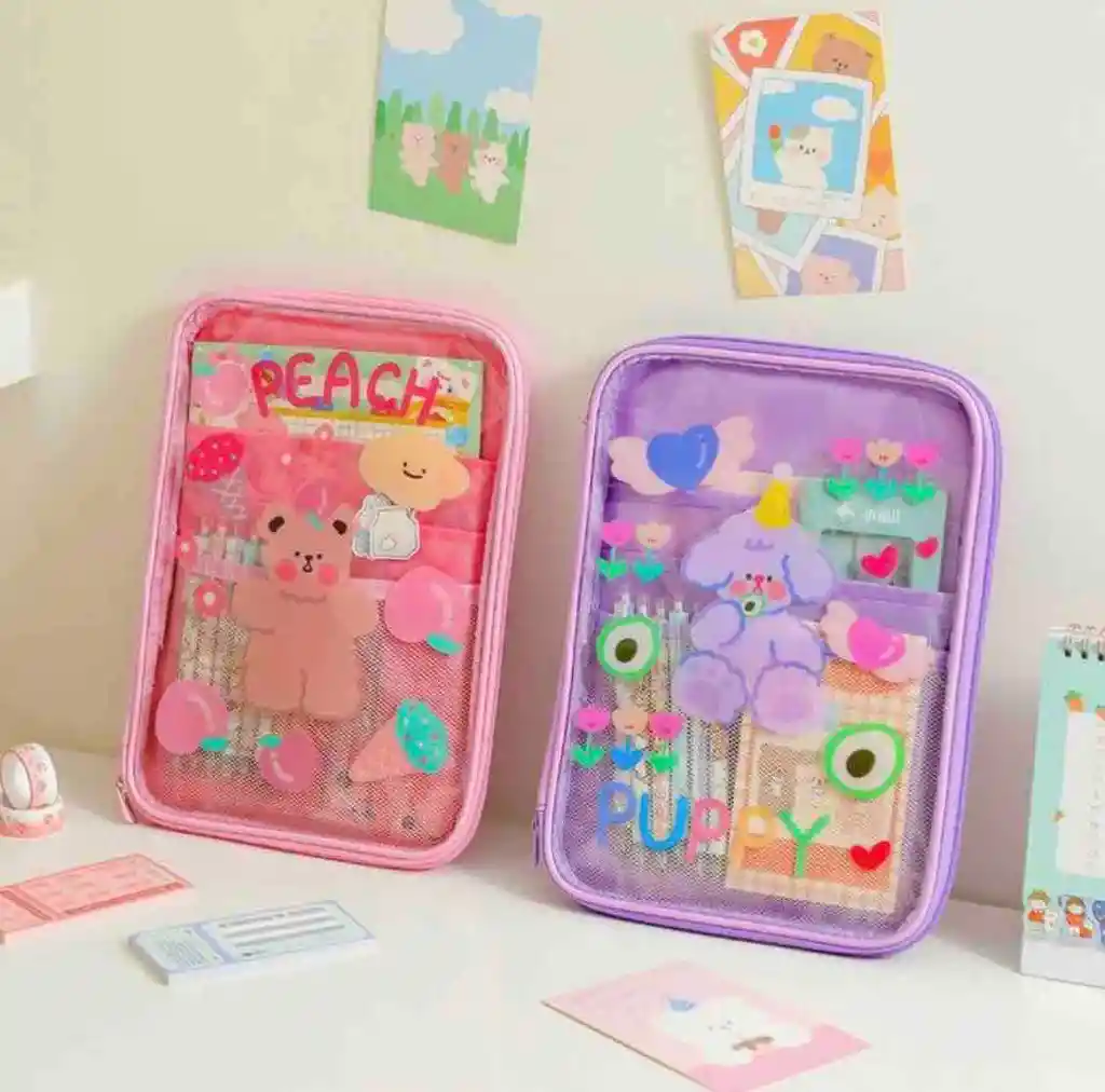 Esta linda funda transparente de dibujitos animados, puede utilizarse como cartuchera, carpeta o funda para tableta de 9,7 a 11 pulgadas. Gracias a sus bolsillos internos podrás organizar documentos, esferos entre otros. Medida: 30 x 23 cm Disponible en: rosado, morado y azul