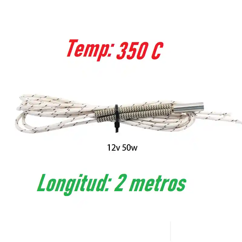 Voltaje: 12V Potencia: 50 W Tamaño de la cabeza de calentamiento: 6 x20 mm Material del cabezal de calentamiento: acero inoxidable 304 Longitud de linea: 2 metros Temperatura de calentamiento: hasta 350 grados Instrucciones del calentador de un solo extremo 1. La parte de calentamiento efectivo del calentador debe mantenerse seca. 2. El conector electrico del calentador de un extremo debe colocarse fuera de la capa de aislamiento y la sala de calefaccion, y el voltaje de funcionamiento no debe exceder su valor nominal del 10%. El caparazon debe estar efectivamente conectado a tierra. 3. Ambiente de trabajo de los componentes electricos, la temperatura no debe ser superior a 95 grados, sin gases s o corrosivos. 4. Los componentes electricos deben almacenarse en un lugar seco. La mejora en comparacion con el calentador rojo ordinario 1. Desde la linea de alta temperatura ordinaria original de 0.3 lineas hasta la linea blanca gruesa de alta temperatura de 0.5 lineas, puede soportar una temperatura mas alta. 2. De la potencia original de 40 W a 50 W, por lo tanto, la temperatura maxima aumenta de 300-31 C a 340-350 C mas o menos. 3. La nueva version de calentador utilizada en todas las habilidades importadas, el uso de acero inoxidable 304, con el uso interno de alambre de niquel cromo 2080 para lograr la maxima vida util. 4. Apoyar la personalizacion de diferentes especificaciones, longitud, resistencia del calentador. 5. Se puede usar con el nuevo termistor de temperatura HT-NTC100K (la medicion de temperatura puede ser de hasta 350 grados). LA COMPRA INCLUYE: 1X CARTUCHO CALENTADOR 12V 50W LONGITUD 2 Metros