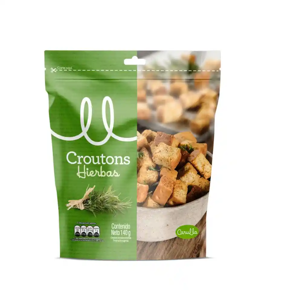 Son cubitos de pan tostado, ideales para consumir con cremas, sopas y ensaladas. Entre sus ingredientes sobresalen mezclas de especias deshidratadas. Packing: Bolsa