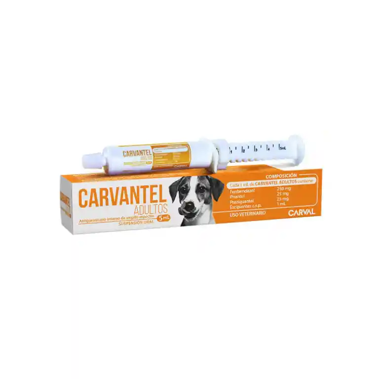 Carvantel para perros adultos es un antiparasitario de amplio espectro, diseñado específicamente para el control y tratamiento de parasitosis gastrointestinales en perros adultos. Su fórmula está compuesta por fenbendazol, pirantel y praziquantel, lo que le permite actuar eficazmente contra nematodos, cestodos y protozoos como Toxocara canis, Taenia spp. y Giardias sp. El producto se presenta en forma de suspensión, facilitando su administración oral mediante una jeringa dosificadora. Control Efectivo de Parasitosis Fácil Administración en Suspensión Oral Activo Contra Nematodos, Cestodos y Protozoos Dosis Única y Rápido Accionar