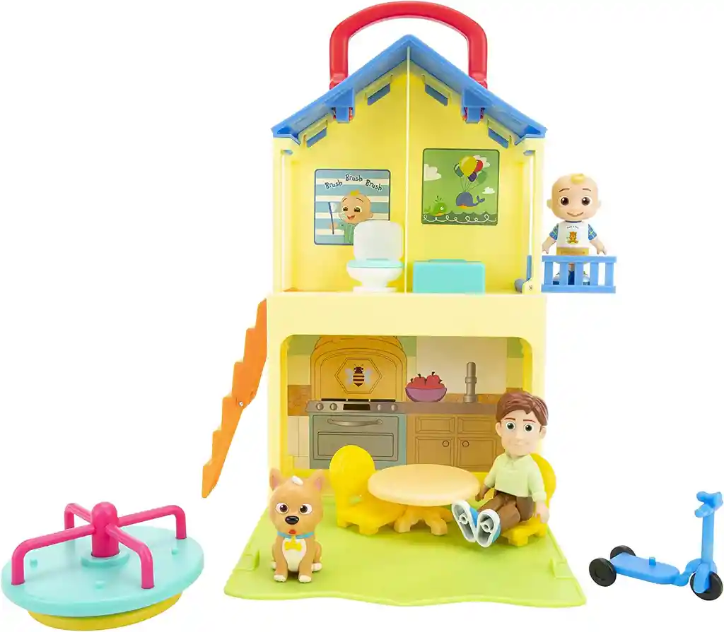 Inspirada en COCOMELON: esta casita Deluxe Pop n’ Play House está inspirada en el exitoso programa infantil JJ, papá y Bingo - Este juego trae al adorable JJ, a su papá y a Bingo el cachorro PLAYTIME FUN Accesorios para el hogar y el aire libre: 2 sillas, una mesa, un inodoro, una calesita y un scooter Fácil de almacenar: cuando acabe la hora de jugar, presiona hacia abajo la casa con todas las piezas almacenadas en el interior Página para colorear: el embalaje incluye un recorte para colorear para promover la sostenibilidad y las actividades divertidas para los niños
