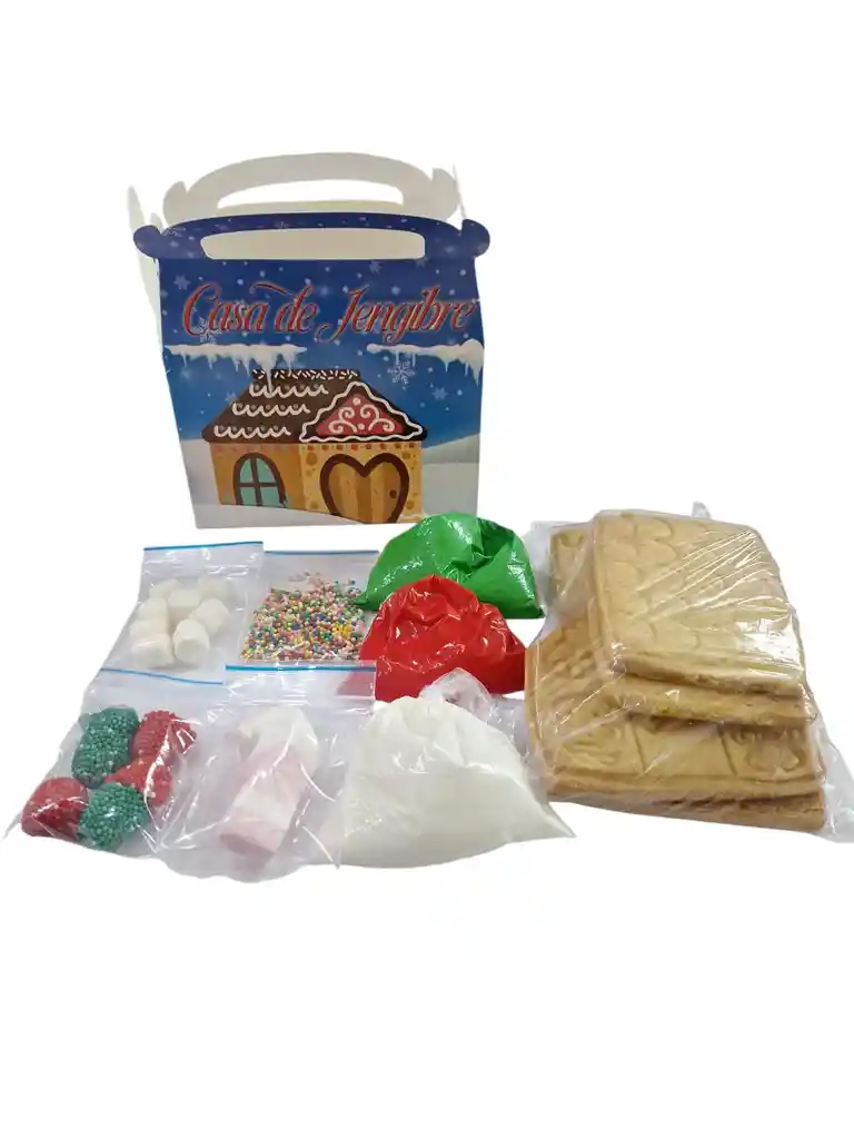 Casa de jengibre para navidad novenas y mucho mas disfruta armando esta deliciosa casa con tus hijos ***medidas de la casa armada alto de la casa armada 10 cm de alto frente de la casa armada 10 cm 10 cm de larga armada ***medidas de cada una de las galletas 10 cm de largo x 7.5 cm de alto del techo 11 cm de alto x 10 cm de ancho frente de la casa 10 cm de ancho x 6.5 cm de alto laterales 3 colores del dulce para pegar la casa (verde, blanco y rojo) 6 unidades de moras 1 masmelo arbol -baston o muñeco de nieve 6 masmelos mini peso aproximado: 400 gramos Arma y después a disfrutar de los deliciosos dulces si deseas algo adicional indícanos y con gusto te Ayudamos Decoración para navidad
