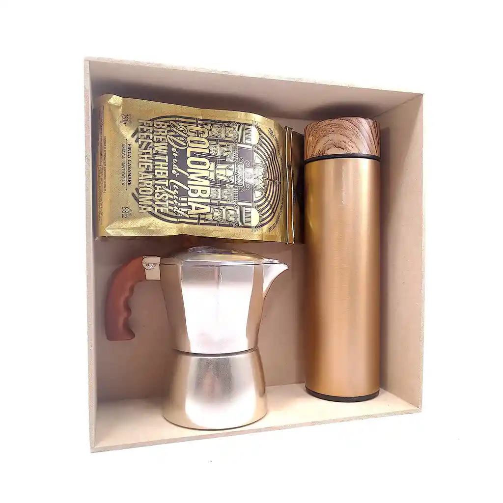 Disfruta nuestro café en uno de los métodos preferidos por nuestros aficionados - la cafetera moka. Con este método para utilizar en una hornilla convencional y café molido podrás disfrutar un café tipo espresso. ya que al igual que las máquinas de espresso hace pasar agua hervida presurizada por vapor a través de café molido. El kit experiencia de café moka contiene: *Café especial Leyenda de el Dorado molido 250g origen Amagá - Antioquia en tueste alto - inspirado en la mítica leyenda viene con un medallón de chocolate en su interior para acompañar tu café. *Termo metálico vacuum flask color dorado. *Cafetera moka dorada para 3 tazas en acero inoxidable. *Estuche de madera con historia e instrucciones de uso.