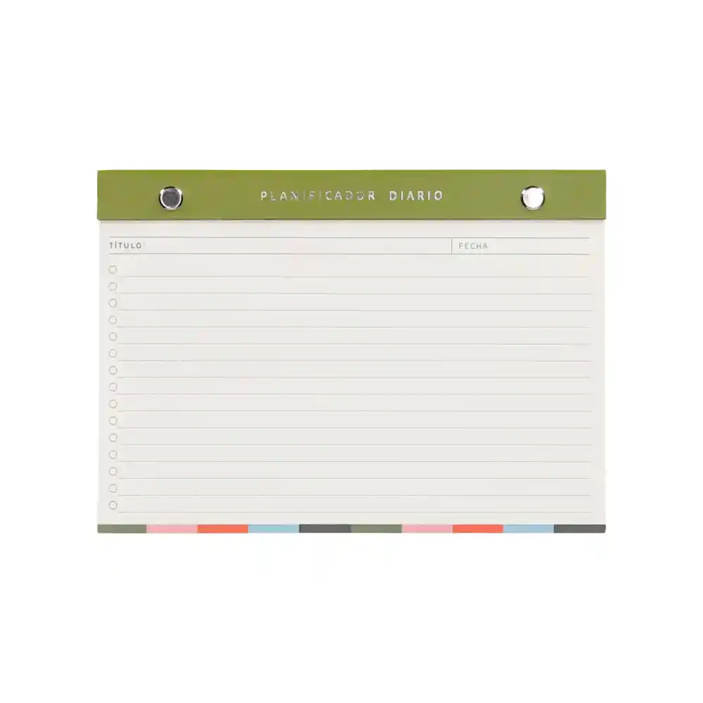 Un Práctico Block Planificador Para Que Organices tu Día Anotando Todas Tus Actividades Reuniones y Recordatorios. Tiene Formato de Block Para Que Puedas Sacar la Página Fácilmente y Utilizar Una Nueva. Cantidad de Páginas: 90 Hojas. Medidas: 142 x 20 cm. Gramaje: 100 g. Composición: 100% Papel Libre de Madera 100 g. Cartón Texturado Aplicaciones de Metal. ''En Casaideas Encontrarás Artículos de Diseño Para Vivir Día a Día en un Espacio Que te Haga Feliz.''