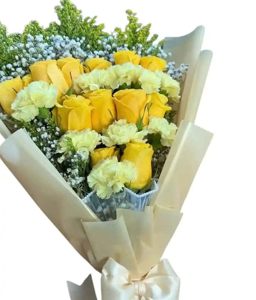 Ramo de 12 rosas, clavel, gipso y solydago en forma de cascada Incluye: Papel decorativo premium, moño artesanal y fino follaje. Personalización: Si deseas agregar una tarjeta con mensaje o remitente, por favor escríbelo en la sección de "Comentarios" al realizar tu pedido o indícalo por el chat a tu Rappitendero. Nota: El tono de las flores puede variar ligeramente según disponibilidad para garantizar la mayor frescura.