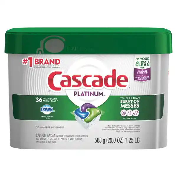 El Detergente Para Lavavajillas Cascade Platinum Actionpacs Limpia Los Restos Quemados en un Solo Lavado Sin Necesidad de Prelavado. La Limpieza de Alimentos Resistentes de Primera Calidad Elimina Los Alimentos Quemados Mientras Que la Acción de Abrillantador Incorporada y el Poder de Dawn Para Combatir la Grasa Hacen Que Sus Platos Deslumbren. Además el Detergente Para Lavar Platos Cascade Platinum Está Formulado Para Ayudar a Prevenir la Filtración de Agua Dura Manteniendo su Máquina Fresca y Limpia. Simplemente Introduce un Actionpac y Revela un Brillo Platino.
