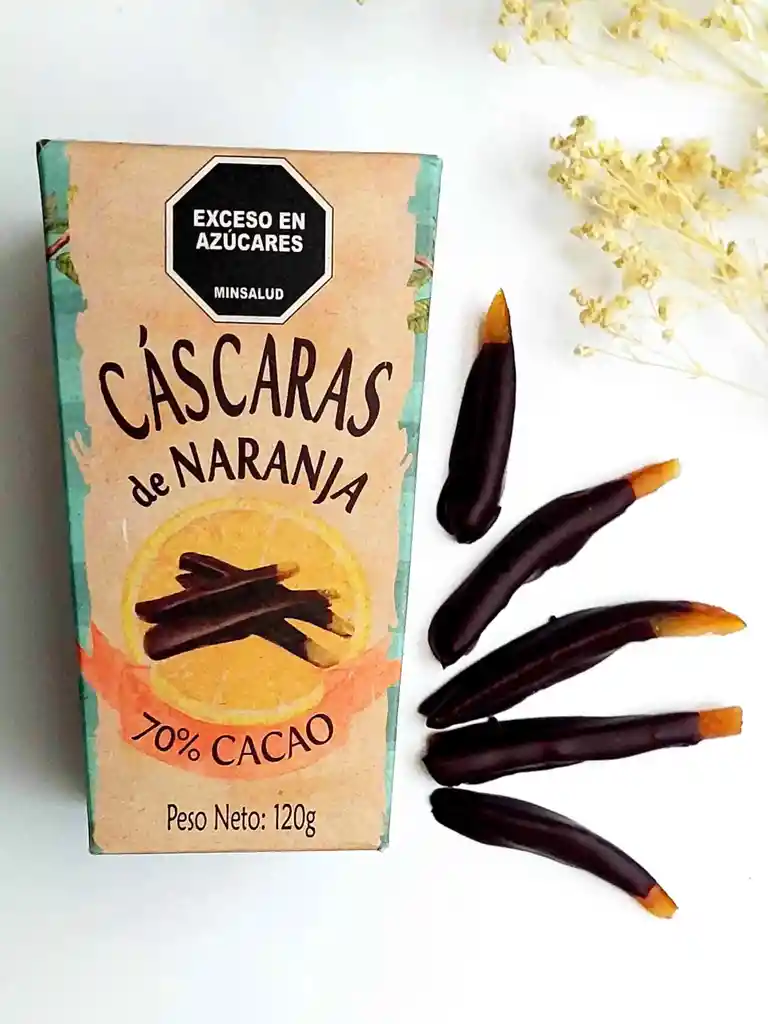 Exquisitas cascaras de naranja confitadas bañadas con chocolate negro 70% Cacao.