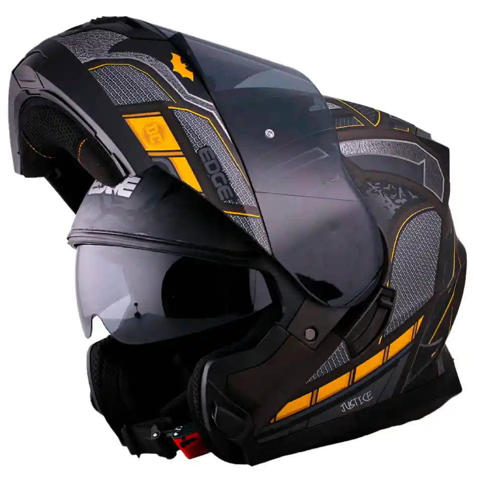 ¡Descubre la oscura elegancia del Casco DC Abatible Cheko Batman Mate de EDGE HELMETS! Este casco para moto, parte de la exclusiva línea de diseños DC COMICS, presenta el emblemático logotipo de Batman en una versión mate que evoca estilo y seguridad. Disponible en tamaños M, L y XL, el modelo BATMAN ofrece versatilidad con sus tres presentaciones: ABATIBLE, INTEGRAL.Diseñado pensando en la modernidad, este casco ha sido optimizado para minimizar el ruido del viento y el arrastre, proporcionando una experiencia de conducción sin igual. El Casco DC Abatible Cheko Batman Mate va más allá de la estética cuenta con el prestigioso CERTIFICADO DOT | ECE, respaldando su resistencia y aprobación según los más altos estándares de seguridad establecidos por el Departamento de Tránsito de Estados Unidos. Con EDGE HELMETS, tu seguridad es nuestra prioridad.