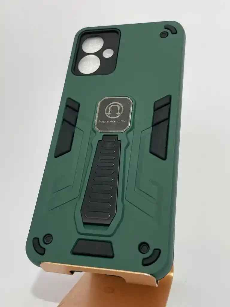Funda tipo armor con soporte y magnetismo para iPhone • Diseño tipo armor de alta resistencia • Soporte trasero integrado tipo clip para mejor agarre • Sistema magnético (Magnet Adsorption) compatible con soportes magnéticos de auto • Material doble capa: TPU flexible + PC rígido • Protección reforzada contra golpes y caídas • Esquinas con absorción de impactos • Marco elevado para cámara y pantalla • Superficie antideslizante y resistente a rayones • Botones cubiertos con buena respuesta táctil • Ajuste preciso a puertos y controles • Color: verde mate con detalles negros • Estilo robusto, moderno y funcional, ideal para uso diario o trabajo