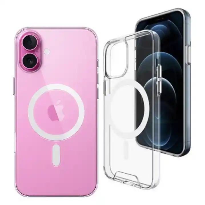 Estuche Magnético transparente con MagSafe y los bordes superior e inferior del marco de TPU se elevan 0,4 mm por encima de la parte posterior de la pc (policarbonato) para que no se raye cuando se coloca el teléfono boca arriba. Protección La fusión de dos materiales cualitativos: TPU suave y plástico duro fusionados en una capa resistente, no solo brindan una gran protección, sino que también permiten que la carcasa mantenga su apariencia transparente durante mucho tiempo.
