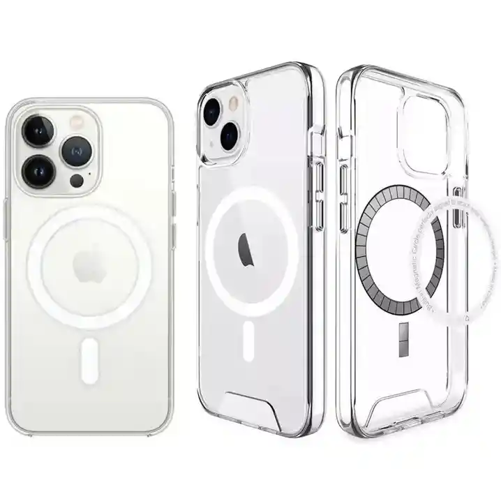 Estuche Magnético transparente con MagSafe y los bordes superior e inferior del marco de TPU se elevan 0,4 mm por encima de la parte posterior de la pc (policarbonato) para que no se raye cuando se coloca el teléfono boca arriba. Protección La fusión de dos materiales cualitativos: TPU suave y plástico duro fusionados en una capa resistente, no solo brindan una gran protección, sino que también permiten que la carcasa mantenga su apariencia transparente durante mucho tiempo.