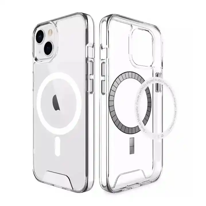 Estuche Magnético transparente con MagSafe y los bordes superior e inferior del marco de TPU se elevan 0,4 mm por encima de la parte posterior de la pc (policarbonato) para que no se raye cuando se coloca el teléfono boca arriba. Protección La fusión de dos materiales cualitativos: TPU suave y plástico duro fusionados en una capa resistente, no solo brindan una gran protección, sino que también permiten que la carcasa mantenga su apariencia transparente durante mucho tiempo.