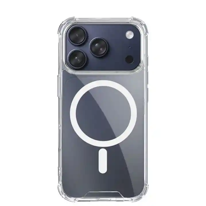 Estuche Magnético transparente con MagSafe y los bordes superior e inferior del marco de TPU se elevan 0,4 mm por encima de la parte posterior de la pc (policarbonato) para que no se raye cuando se coloca el teléfono boca arriba. Protección La fusión de dos materiales cualitativos: TPU suave y plástico duro fusionados en una capa resistente, no solo brindan una gran protección, sino que también permiten que la carcasa mantenga su apariencia transparente durante mucho tiempo.