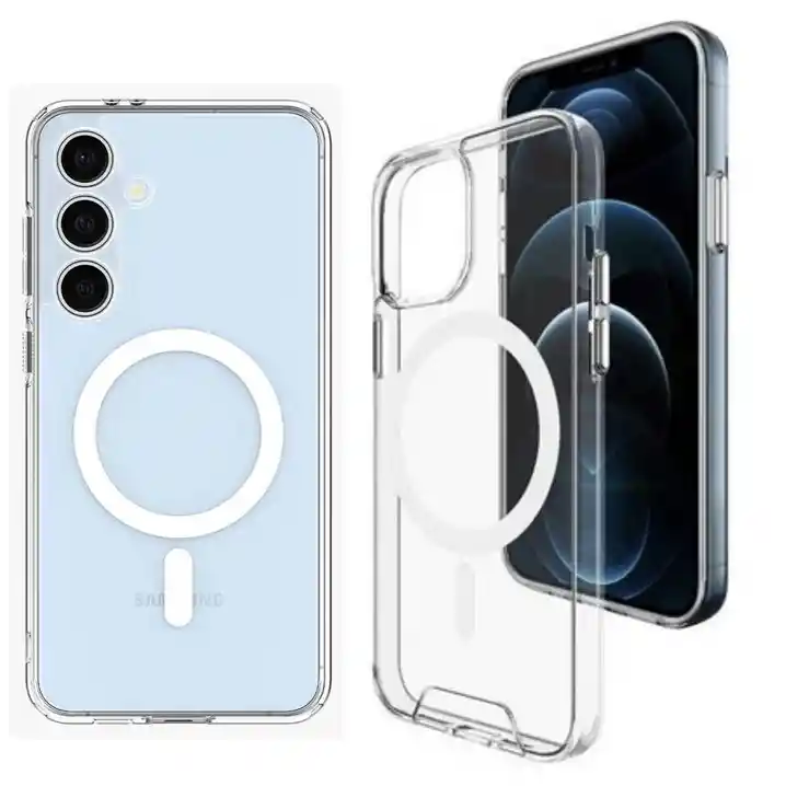 Estuche Magnético transparente con MagSafe y los bordes superior e inferior del marco de TPU se elevan 0,4 mm por encima de la parte posterior de la pc (policarbonato) para que no se raye cuando se coloca el teléfono boca arriba. Protección La fusión de dos materiales cualitativos: TPU suave y plástico duro fusionados en una capa resistente, no solo brindan una gran protección, sino que también permiten que la carcasa mantenga su apariencia transparente durante mucho tiempo.
