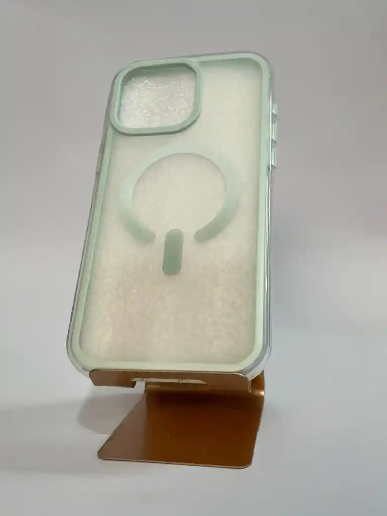 Funda Magnética Translúcida con Bordes Verde Menta • Diseño elegante y moderno con acabado translúcido esmerilado • Aro magnético integrado compatible con cargadores y accesorios MagSafe • Bordes y aro en color verde menta que aportan un toque delicado y femenino • Marco reforzado para mayor protección contra golpes y caídas • Protección elevada para cámara y pantalla • Material resistente y flexible (TPU + policarbonato) • Botones cubiertos, sensibles y de fácil acceso • Ajuste preciso que no añade volumen excesivo al equipo • Superficie antideslizante y anti-huellas Características destacadas: Transparencia premium que mantiene el diseño original del iPhone. Protección 360° contra caídas, golpes y rayones. Aro MagSafe integrado compatible con carga inalámbrica y accesorios magnéticos. Bordes suaves y antideslizantes para mejor agarre y confort. Material anti-amarillamiento, ultra claro y resistente al uso diario. Diseño ultraligero, sin sacrificar protección.