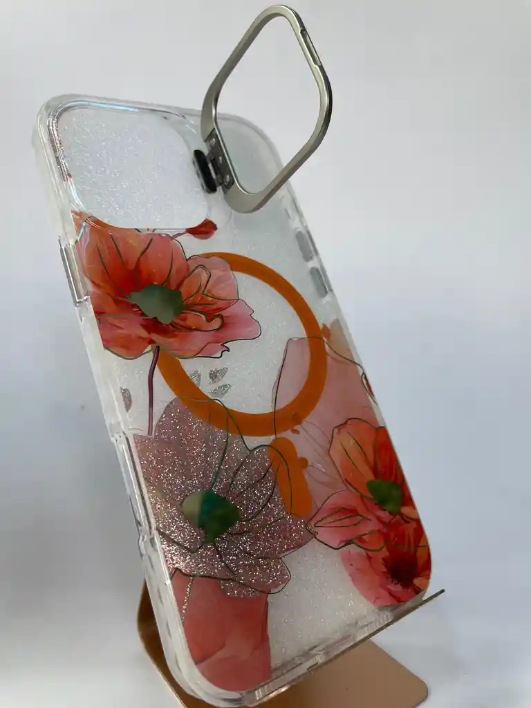 Funda Transparente Floral con Aro Naranja y Soporte Metálico Protege tu iPhone con estilo gracias a esta hermosa funda floral transparente, que combina elegancia, brillo y funcionalidad. Su diseño con flores rosadas con destellos le da un toque femenino y moderno, mientras que el aro magnético naranja permite una conexión segura con cargadores y accesorios MagSafe. ✨ Características destacadas: • 🌷 Diseño floral elegante: Flores en tonos rosados con efecto brillante que realzan el teléfono. • 🔸 Aro magnético MagSafe: Compatible con carga inalámbrica y accesorios magnéticos. • 💎 Soporte metálico integrado: Permite apoyar el teléfono cómodamente para ver videos o videollamadas. • 🧼 Material TPU transparente: Flexible, resistente y con bordes reforzados contra caídas. • ⚡ Protección total: Bordes elevados para proteger la pantalla y la cámara. • 🪶 Ultraligera y cómoda: No añade peso ni volumen al dispositivo. • 🎯 Ajuste perfecto: Acceso fácil a todos los botones, puertos y funciones. Ideal para quienes buscan una funda funcional, elegante y con estilo floral único.