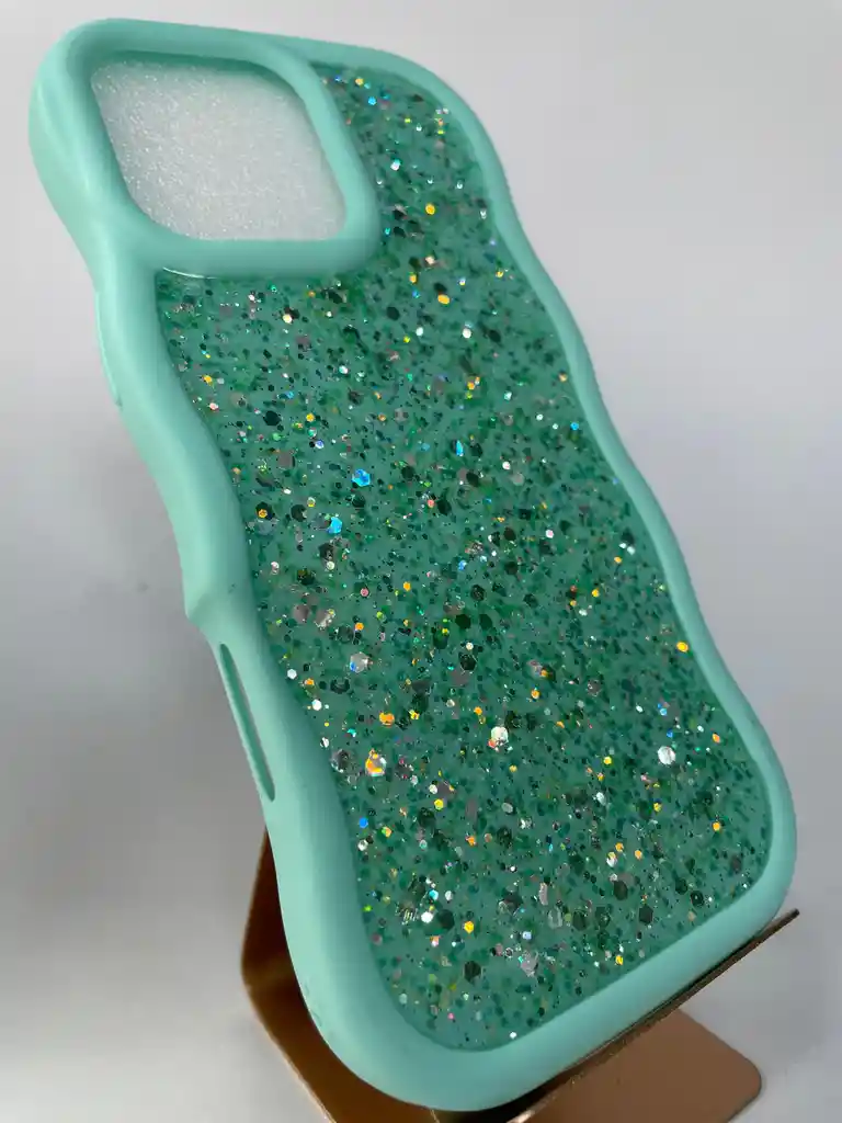 Dale un toque de glamour a tu celular con esta increíble funda VERDE MENTA ideal para los que aman los detalles brillantes Material: Silicona flexible y resistente con bordes ondulados que mejoran el agarre y absorben impactos Parte trasera con efecto Glitter brillantes que reflejan la luz y crea destellos únicos Protección total para los bordes Ajuste perfecto para tu iPhone con recortes precisos para botones y puertos Diseño moderno juvenil y lleno de personalidad, ideal para quienes buscan una funda llamativa resistente y con mucho estilo