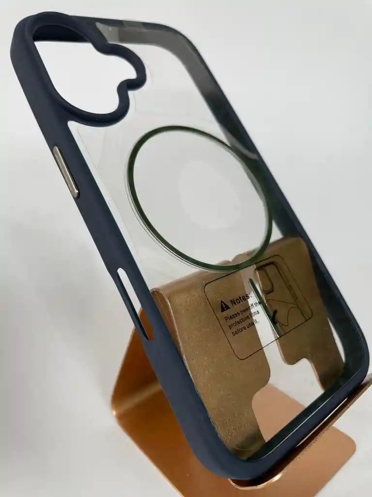 Tipo: Funda protectora híbrida con borde de silicona y parte trasera transparente. • Compatibilidad: iPhone (modelo según tamaño de cámara, parece iPhone 17 • Material: • Borde de TPU suave (silicona flexible) para absorber impactos. • Parte trasera de policarbonato transparente resistente a rayones. • Color del borde: Azul oscuro. • Diseño: • Transparente para mostrar el color original del teléfono. • Anillo magnético integrado (MagSafe) para carga inalámbrica y accesorios compatibles. • Recortes precisos para cámara, botones, puertos y altavoces. • Protección: • Refuerzo en las esquinas contra caídas. • Bordes elevados para proteger pantalla y cámara. • Funcionalidad adicional: • Compatible con carga inalámbrica MagSafe. • Antideslizante y resistente a huellas.