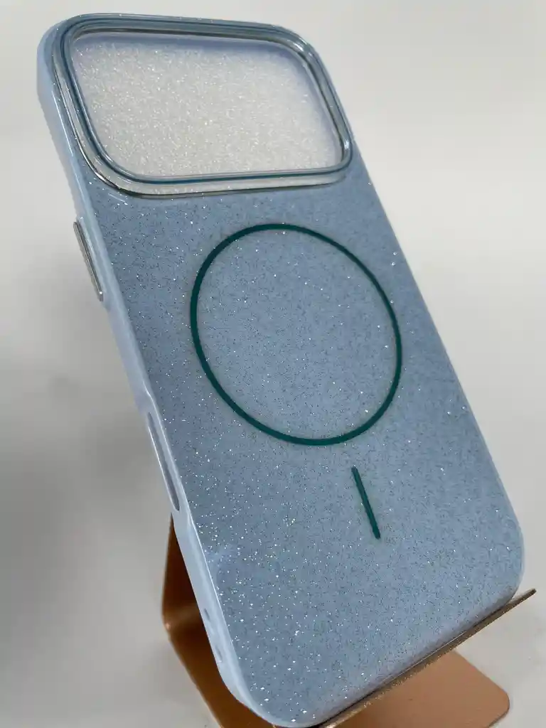 Funda Azul Clarito con brillo y aro magnético Características: • Material: TPU flexible con acabado brillante y escarchado. • Diseño: Color rosado con efecto glitter y aro magnético integrado. • Compatibilidad: Modelos de iPhone 17 Pro (según tamaño del módulo de cámara). • Protección: • Borde elevado para mayor seguridad de cámara y pantalla. • Esquinas reforzadas con absorción de impactos. • Resistente a rayones y caídas. • Funcionalidad: • Compatible con carga inalámbrica y accesorios MagSafe. • Ajuste preciso en botones, puertos y cámara. • Estilo: Elegante, moderno y femenino con acabado brillante. • Color disponible: Azul Clarito con destellos plateados.