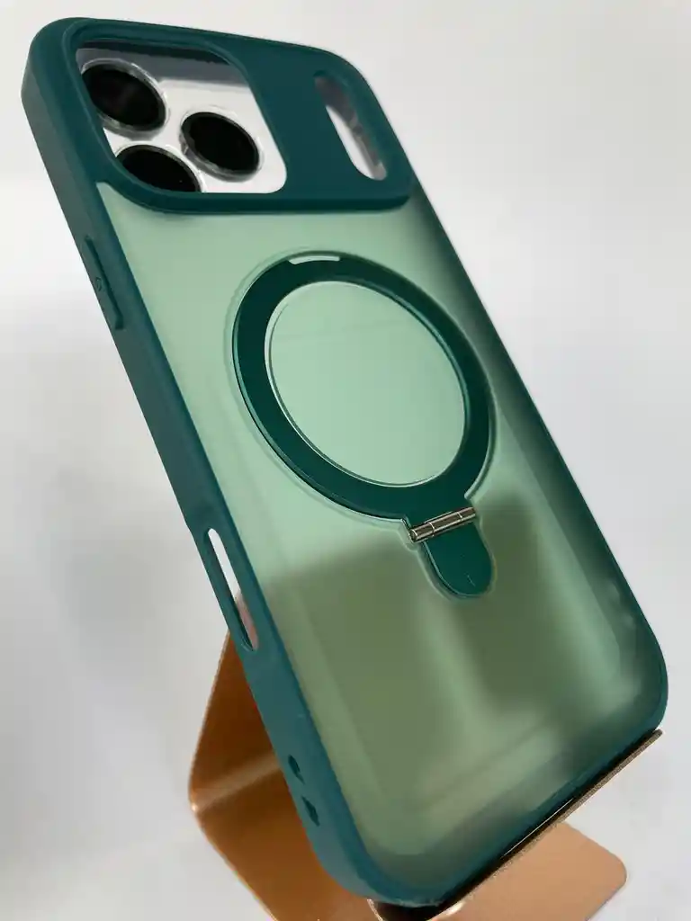 Tipo de funda: Case protector con aro magnético y soporte integrado. • Material: Combinación de TPU flexible en los bordes y PC rígido translúcido en la parte posterior. • Color: Bordes Verde oscuro con fondo verde claro translúcido. • Compatibilidad: Diseñada para iPhone con triple cámara (posiblemente iPhone 17 Pro Max • Soporte MagSafe: Sí, incluye anillo magnético integrado compatible con accesorios MagSafe. • Soporte metálico: El aro magnético incluye soporte abatible tipo “ring stand” que permite usar el teléfono en posición horizontal o vertical. • Protección de cámara: Marco elevado alrededor del módulo de cámaras para evitar rayones. • Botones metálicos: Laterales con acabado metálico a tono. • Protección 360°: Borde reforzado para proteger pantalla y cámara ante caídas o impactos. • Diseño: Estilo moderno, delgado, con acabado mate translúcido y sensación suave al tacto.