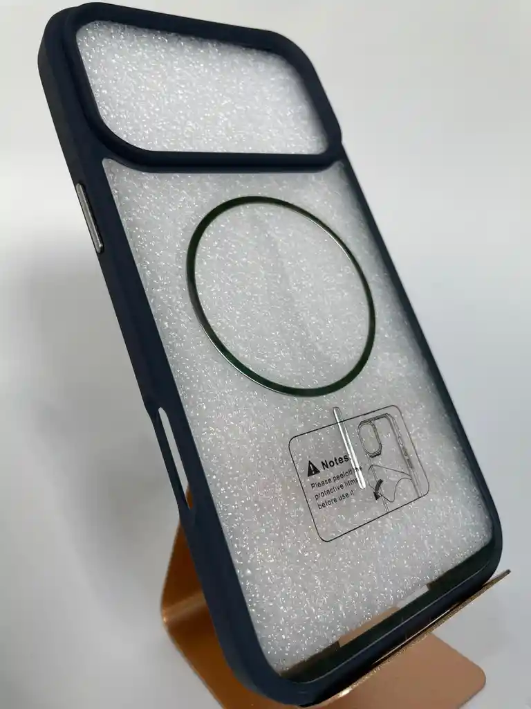 Tipo: Funda protectora híbrida con borde de silicona y parte trasera transparente. • Compatibilidad: iPhone (modelo según tamaño de cámara, parece iPhone 17 Pro Max • Material: • Borde de TPU suave (silicona flexible) para absorber impactos. • Parte trasera de policarbonato transparente resistente a rayones. • Color del borde: Azul Oscuro. • Diseño: • Transparente para mostrar el color original del teléfono. • Anillo magnético integrado (MagSafe) para carga inalámbrica y accesorios compatibles. • Recortes precisos para cámara, botones, puertos y altavoces. • Protección: • Refuerzo en las esquinas contra caídas. • Bordes elevados para proteger pantalla y cámara. • Funcionalidad adicional: • Compatible con carga inalámbrica MagSafe. • Antideslizante y resistente a huellas.