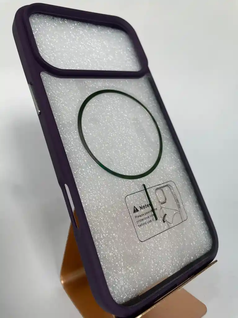 Tipo: Funda protectora híbrida con borde de silicona y parte trasera transparente. • Compatibilidad: iPhone (modelo según tamaño de cámara, parece iPhone 17 Pro Max • Material: • Borde de TPU suave (silicona flexible) para absorber impactos. • Parte trasera de policarbonato transparente resistente a rayones. • Color del borde: Morado. • Diseño: • Transparente para mostrar el color original del teléfono. • Anillo magnético integrado (MagSafe) para carga inalámbrica y accesorios compatibles. • Recortes precisos para cámara, botones, puertos y altavoces. • Protección: • Refuerzo en las esquinas contra caídas. • Bordes elevados para proteger pantalla y cámara. • Funcionalidad adicional: • Compatible con carga inalámbrica MagSafe. • Antideslizante y resistente a huellas.
