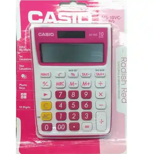 10 dígitos Cálculo de impuestoCálculo e impresión automática del precio más el impuesto, precio menos el impuesto, descuento, precio de venta, importe de impuesto, importe de descuento e importe de margen de ganancia. Cálculo de tiempoEl cálculo de tiempo le permite ingresar y calcular fácilmente los valores en hora, minutos y segundos. Solar + PilaEnergía solar cuando hay suficiente luz , por pila cuando la luz es insuficiente. Signos de mandos de funcionesUn símbolo (+, -, ×, ÷) en la pantalla indica el tipo de operación que usted está efectuando en ese momento. Pulsación simultánea de teclasLas operaciones se almacenan en un búfer, así nada se pierde ni durante los ingresos de alta velocidad. Pantalla extra grandeLa pantalla más grande hace que los datos sean más fáciles de leer. Teclas plásticasDiseñadas y preparadas para ser de uso fácil. Porcentaje de margen de gananciaLa tecla "%" proporciona rápido acceso a precios y ganancias, como también ofrece alzas, descuentos, relaciones y valores de aumento o disminución.