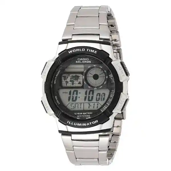 Material de la carcasa y el marco: ResinaHebilla de tres plieguesCorrea de Acero InoxidableCristal Mineral / Cristal EsféricoResistencia al Agua de 100 MetrosIluminación por LEDSelección de duración de iluminación, persistencia luminosaHora múltiple (4 cuidades diferentes)Hora munesferas31 zonas horarias (48 ciudades + diferencia de hora universal coordinada), horario de verano (Activado y desactivado), cambio de hora local a hora munesferasCronómetro de 1/100 segundosCapacidad de medición: 23:59'59.99''Modos de medición: tiempo transcurrido, tiempo de división, tiempos de 1ª y 2ª posicionesTemporizadoresUnidad de medida: 1/10 segundosRango de entrada: de 1 segundo a 24 horas (incrementos de 1 segundo, incrementos de 1 minuto y de 1 hora)Cinco alarmas diarias o de una sola vezSeñal de horaCalendario completamente automático (hasta el año 2099)Formato de 12 y 24 horasActivado y desactivado de tono de funcionamiento de botóFunciones clásicas de relojDigitales: Hora, minuto, segundo, pm, mes, fecha, díaPrecisión: ±30 segundos por mesTamaño de la caja : 48,1×43,7×13,7mmPeso total : 96g