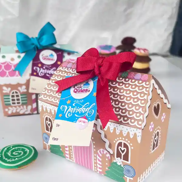 Casita navideña rellena con 15 galletas artesanales surtidas de vainilla, mantequilla, jengibre, canela, naranja, chocolate, decorada con moño y tarjeta para regalar. (IMAGEN DE REFERENCIA)