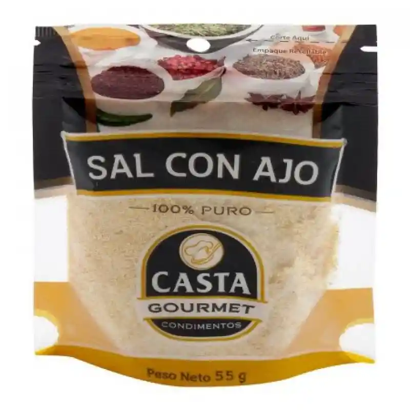 Sal Con Ajo Casta Gourmet 55g-Blanco Sal con ajo que realza el sabor de las comidas. Combina bien con carnes, mariscos, pescados y verduras. Registro sanitario RSAE17I8315 Medidas en Centimetros: 12x3x9