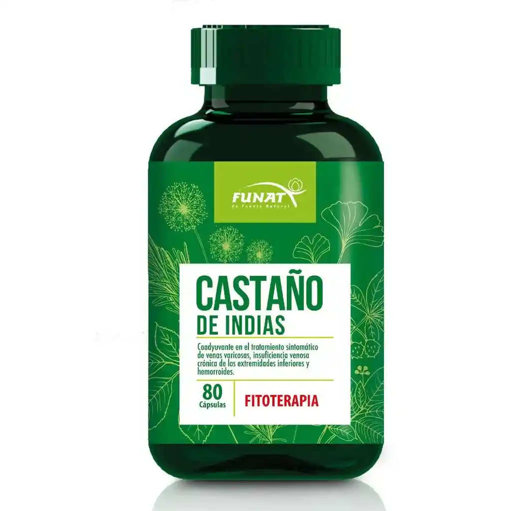 Cada cápsula contiene: Semillas secas y molidas de Castaño de indias (Aesculus hippocastanum L.) (Equivalente a no menos de 3% de glicósidos triterpénicos calculados como escina) 300 mg.