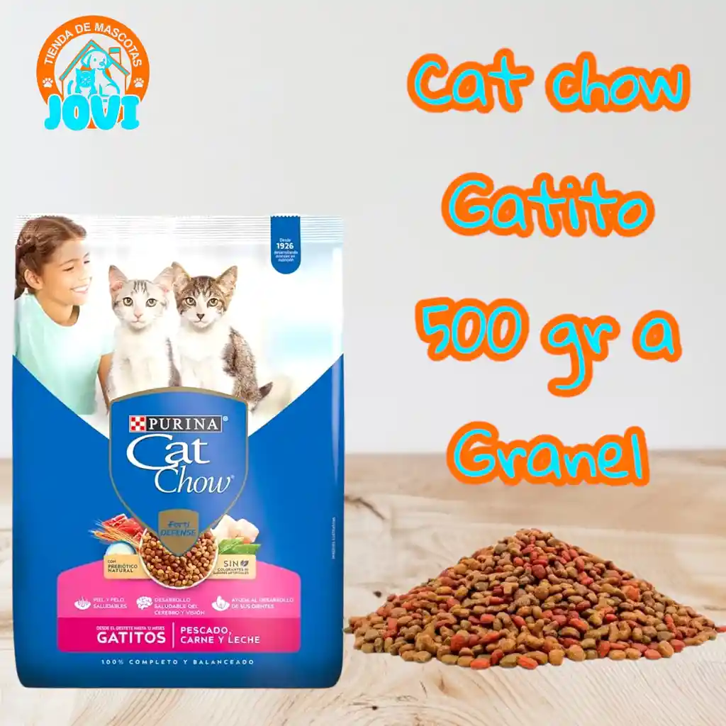 CAT CHOW GATITOS a granel de 500g es un concentrado completo y balanceado para gatitos de hasta 12 meses. Contiene prebióticos para una mejor absorción de nutrientes, DHA para el desarrollo cerebral y visual, y zinc y omega 3 y 6 para piel y pelaje saludables. No tiene colorantes ni sabores artificiales y aporta calcio para dientes fuertes.