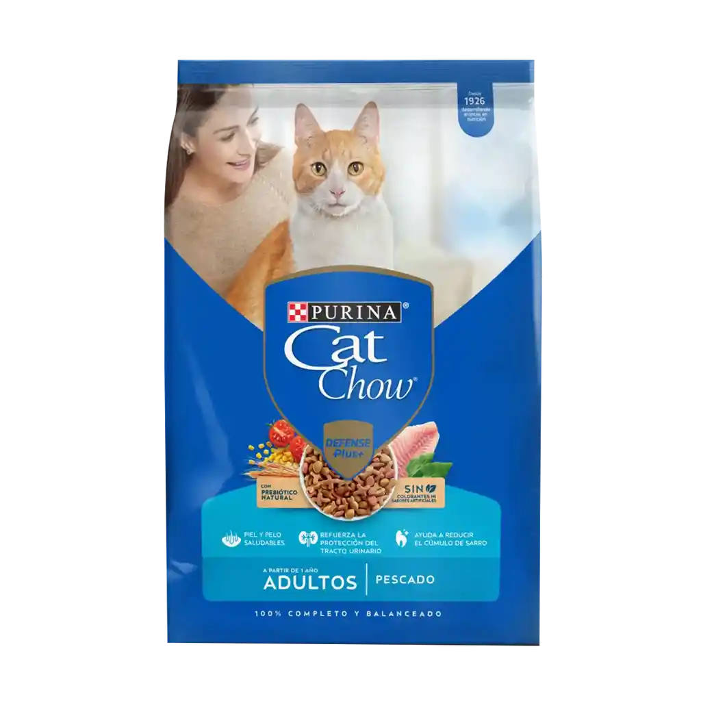 Cat Chow Pescado Gato Adulto (8 kg) es un alimento seco diseñado para gatos adultos. Su fórmula está enriquecida con ácidos grasos omega-3 y omega-6 provenientes del pescado, lo que ayuda a mantener una piel saludable y un pelaje brillante. Además, contiene proteínas de alta calidad y nutrientes esenciales para apoyar el sistema inmunológico y la salud general de tu gato