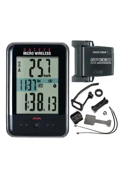 Se ve bien en el manillar o en la potencia: el ciclocomputador Micro Wireless CC-MC200W de CATEYE Ajuste la pantalla a tus necesidades. El nuevo Micro Wireless de Cat Eye te permite seleccionar las funciones que quieres tener durante el recorrido. Lo que más te interesa, puedes hacerlo visualizar de forma permanente. 9 funciones y 9 características, incluyendo la retroiluminación y un cronómetro separado para tel tiempo total de la gira. Todo esto en un diseño simple y plano, con el sistema FlexTight™ bien sujeto al manillar o a la potencia. Indicaciones acerca de la devolución de pilas, baterías y equipos eléctricos: Información acerca de la devolución y eliminación de pilas, baterías, y equipos usados la encuentras aquí Datos técnicos: Medidas: 53,5 x 36,0 x 17,5 mm Abastecimiento de energía del computador: Pila, 1 x CR2032 Sensor de abastecimiento de energía: Pila, 1 x CR2032 Funciones: 9 Funciones: - Velocidad actual - Tiempo de recorrido - Distancia recorrida - Velocidad media - Retroiluminación (Modo nocturno) - Velocidad máxima - Kilometraje total - Cronómetro - Reloj 12/24 horas Características: - modo de ahorro de energía automático - modo de espera automático - arranque y parada automáticos (automático o manual) - kilometraje ajustable - tiempo de conducción suplementario independiente, distancia y velocidad media