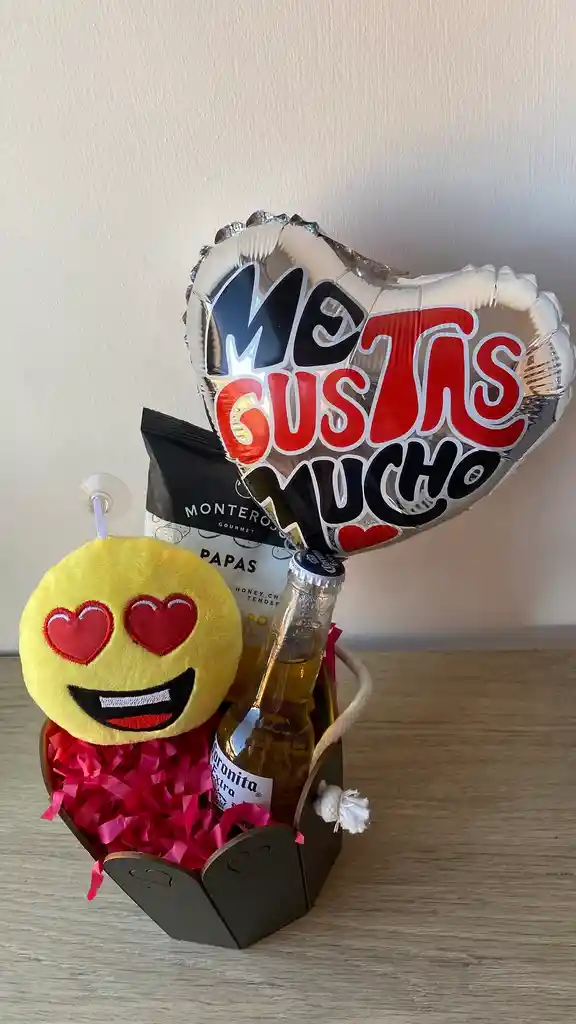 Disfruta esta cava con troquel corazones, contiene cerveza coronita, snacks, dulces y tarjeta de amor.