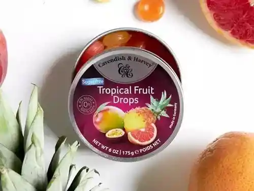 Caramelos Cavendish sin azúcar sabor frutas tropicales.