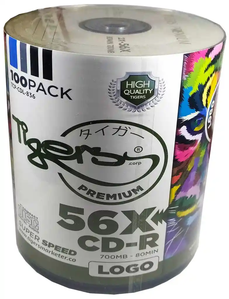Marca TIGERSTipo de disco CDsUnidades por envase 100Velocidad de escritura del disco 2x-56xNo es imprimibleCapacidad de almacenamiento: 700 MB