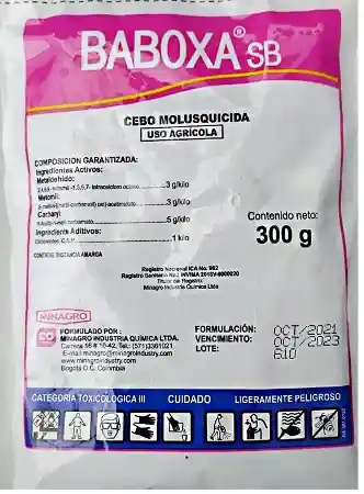 Lugares húmedos con poca luz son los criaderos perfectos de babosas y caracoles. Al principio parecen invertebrados inofensivos, por su paso lento y aspecto pacífico, sin embargo, pueden llegar a convertirse en peligrosos vehículos transmisores de enfermedades, además de destruir cultivos enteros de hortalizas y plantas ornamentales. Baboxa® es un cebo molusquicida de triple acción, diseñado para controlar babosas y caracoles por ingestión y contacto. Su formulación permite el control eficiente de la plaga aún en condiciones adversas de humedad y luz solar. Baboxa® puede ser aplicado de forma preventiva, antes de la lluvia o como tratamiento para controlar grandes infestaciones de moluscos. Su color permite la fácil identificación por parte de la plaga, y como preocupación de seres humanos. Contiene BitterGuard®, sustancia amarga que previene el consumo accidental por parte de animales domésticos y humanos. Su formulación 3 en 1 (Carbaryl 0.5%, Metomil 0.3% y Metaldehído 0.3%) lo hace el mata babosa que nunca falla en las peores condiciones climáticas. Sus ingredientes activos inhiben la acetilcolinesterasa produciendo afectación en el sistema nervioso del animal, además de provocar deshidratación. ×DESCARGUE EL VOLANTE TÉCNICO COMERCIAL DE BABOXA EN: “MOLUSQUICIDA BAB