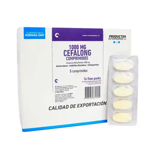 Composición: Cefalexina monohidrato 1000 mg. Dosis: 1 comprimido de 1.000 mg cada 33-40 kg de peso (25 a 30 mg/kg). Intervalo entre dosis: Cada 8-12 horas. Duración del tratamiento: No menos de 7 días. En infecciones rebeldes (piel) puede suministrarse por un lapso mayor a 30 días. Contraindicaciones: No utilizar en animales con antecedentes alérgicos a las Cefalosporinas o a las Penicilinas. Los efectos adversos usualmente no son graves y su frecuencia es reducida. En algunos animales susceptibles puede ocasionar nauseas, vómitos, malestar abdominal, diarreas y anorexia. La administración de la medicación junto con las comidas puede disminuir estos síntomas. Por eso se recomienda la dosificación después de la comida. En caso de insuficiencia renal crónica se deberá aumentar los intervalos entre dosis según el criterio del profesional veterinario.