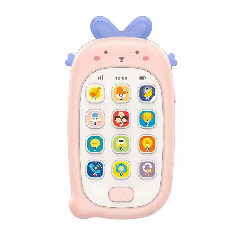 Juguete smartphone interactivo para bebés con dos orejas de goma fijadas en la parte superior. El teléfono está equipado con una pantalla táctil que responde al tacto de los dedos. Al igual que en el caso de un teléfono inteligente real, en la pantalla hay diferentes iconos, Los 12 iconos contienen diferentes sonidos: música, animales, instrumentos, pero también sonidos que imitan un teléfono real (mensajes, tono de llamada). La simpática forma de un animal hará las delicias de los más pequeños, y las orejas son un excelente juguete para la dentición, gracias a sus formas y materiales suaves.