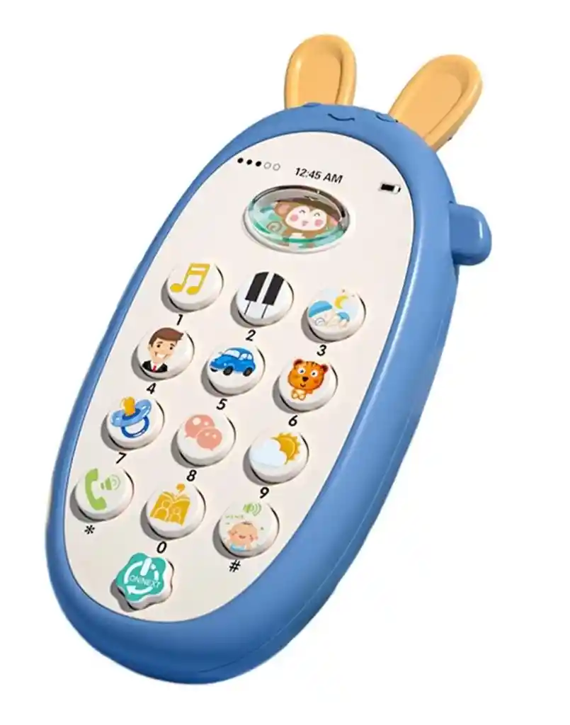 juguete smartphone interactivo para bebés con dos orejas de goma fijadas en la parte superior. El teléfono está equipado con una pantalla táctil que responde al tacto de los dedos. Al igual que en el caso de un teléfono inteligente real, en la pantalla hay diferentes iconos, Los 12 iconos contienen diferentes sonidos: música, animales, instrumentos, pero también sonidos que imitan un teléfono real (mensajes, tono de llamada). La simpática forma de un animal hará las delicias de los más pequeños, y las orejas son un excelente juguete para la dentición, gracias a sus formas y materiales suaves