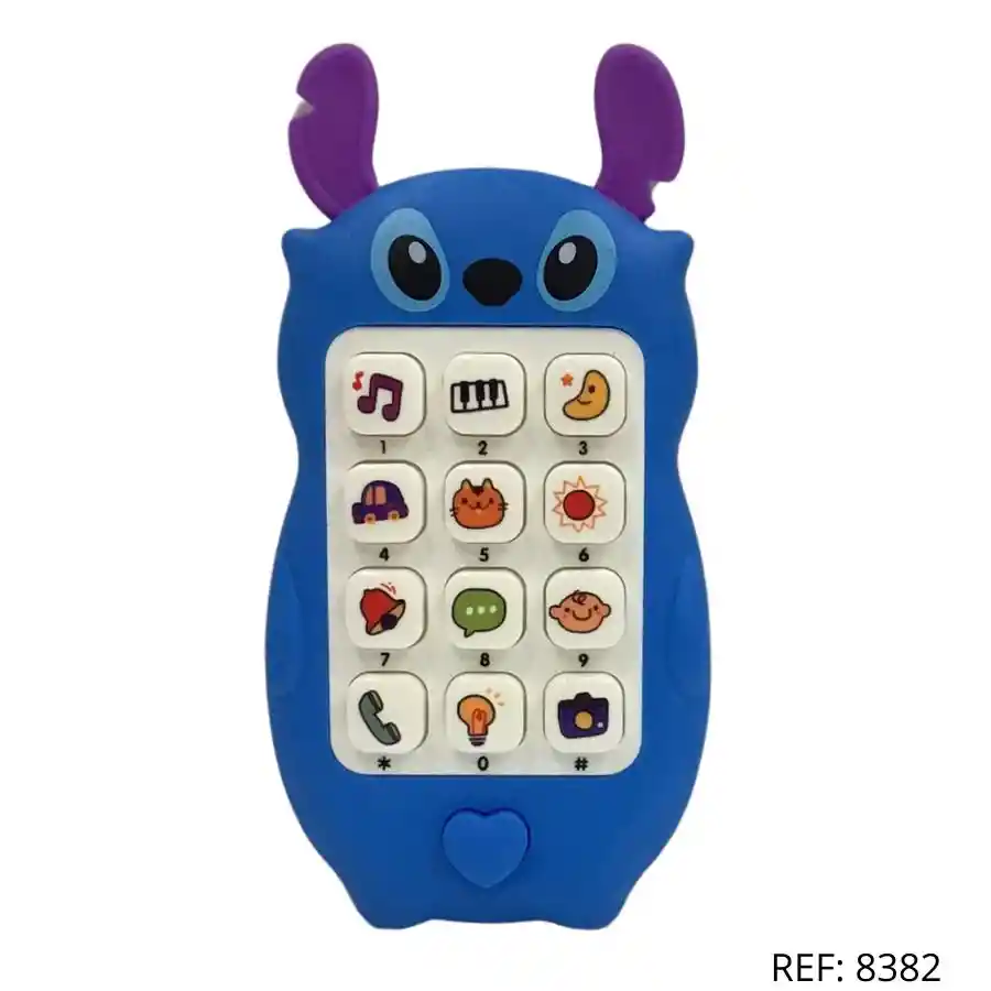 Teléfono azul con orejitas. Sonidos divertidos y botones coloridos. Estimula los sentidos y la coordinación motriz infantil.