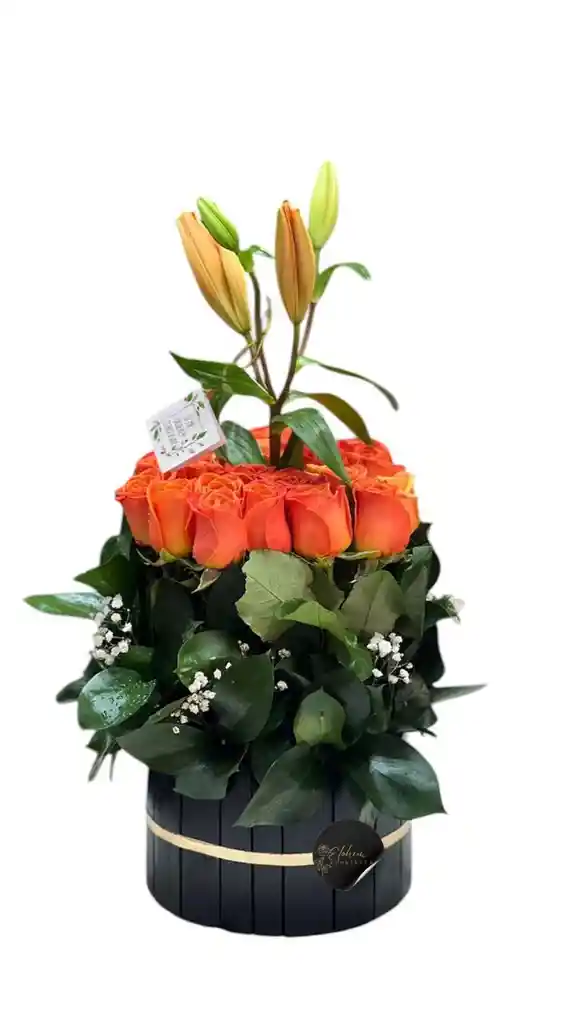arreglo floral con 24 rosas y lirio, perla , coja circular negra