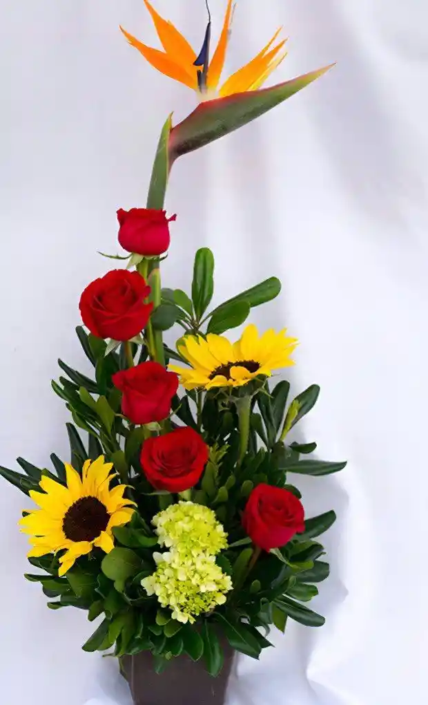 Delicado Arreglo con rosas y girasoles, ideal para cualquier ocasión.
