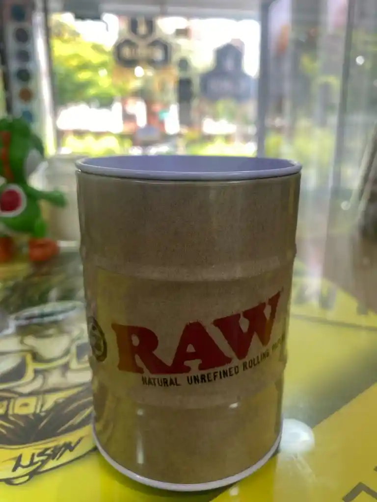 cenicero raw metalico, con espacios para poner cigarillos o joints y contenedor incluido.