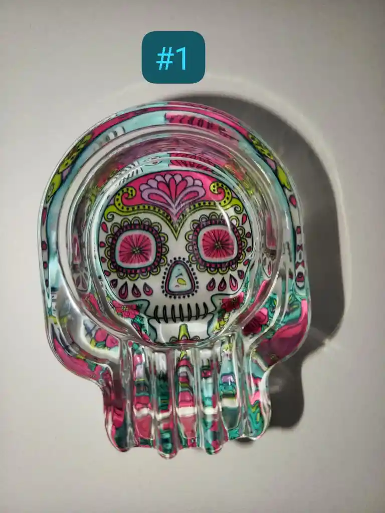 CENICEROS DE CRISTAL CON HERMOSA FORMA DE CALAVERA Y LLAMATIVOS COLORES. FUNCIONAL Y PERFECTO PARA DECORAR. ESPECIFICA EL DISEÑO.
